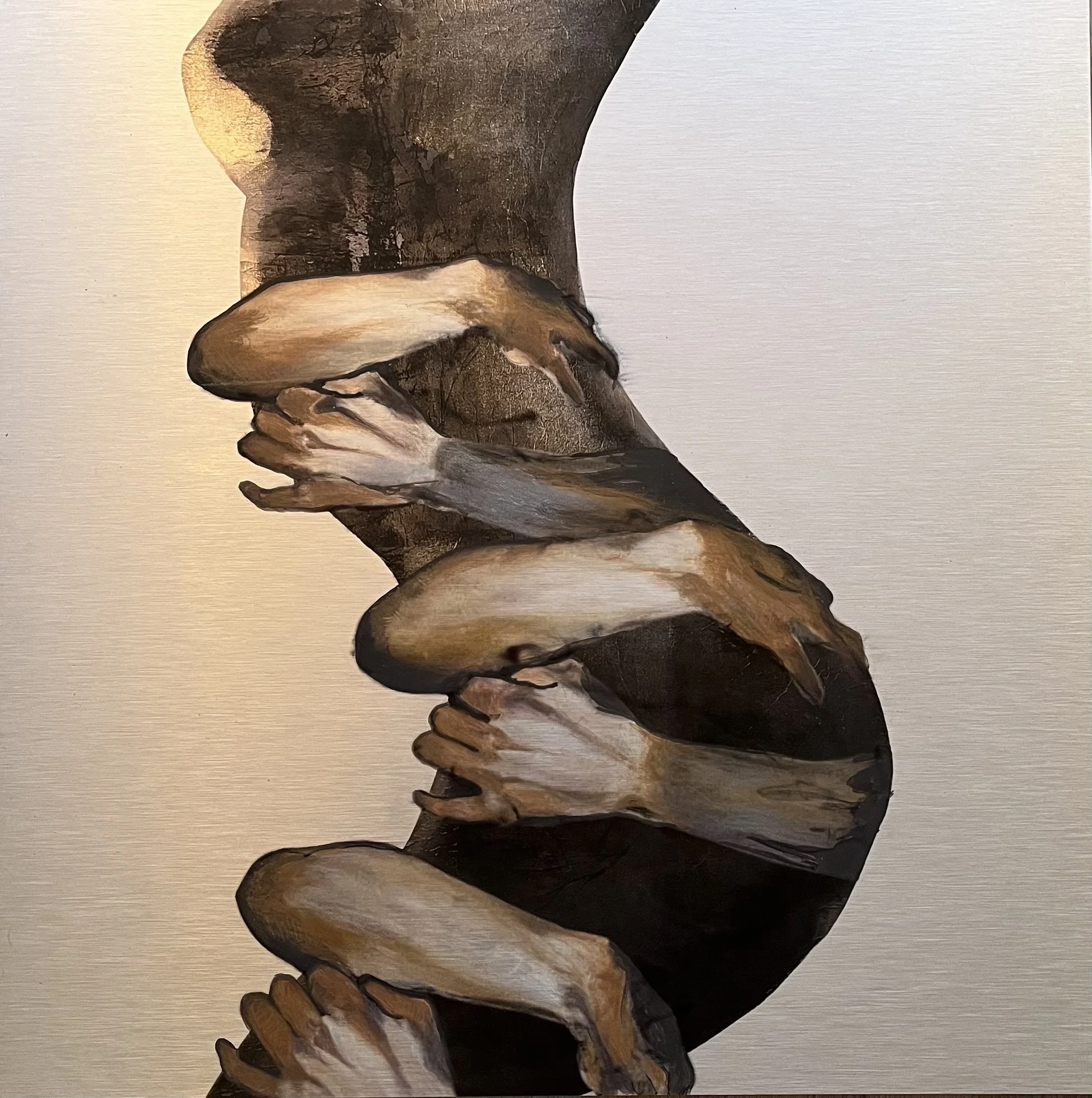 The use of aluminium as a support introduces a subtle luminosity, as if the figures are held within a membrane of light. The textures are fragile, organic, almost archaeological, revealing layers of time and skin, inviting us to reflect on the boundaries between the physical and the metaphysical, the intimate and the universal.